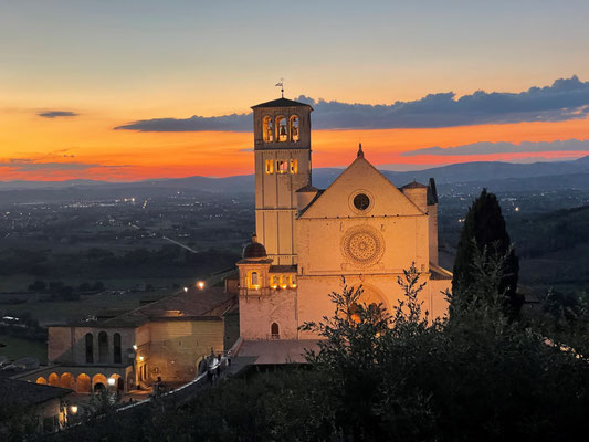 Am Abend war die Ankunft in Assisi. Die Pilgergruppe konnte ihr Quartier im Nahe der Basilika San Francesco gelegenen Hotel beziehen und einen herrlichen Blick in das Spoleto-Tal bei Sonnenuntergang genießen.