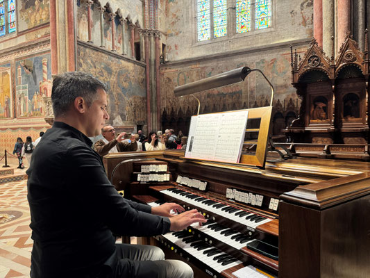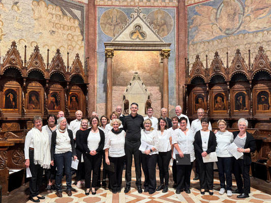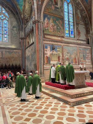 Am ersten Tag begrüßte Franziskanerbruder Thomas Freidel, Pilgerseelsorger in Assisi, die Pilgerinnen und Pilger herzlich. Unter der Leitung von Florian Löffler gestaltete der Chor das Hochamt in der Oberkirche der Basilika San Francesco musikalisch mit. Für alle war dies ein großartiges und ergreifendes Erlebnis. Am Nachmittag hieß es dann, den Spuren des Heiligen Franziskus nachzugehen. Auf dem Programm standen der Besuch des Domes San Rufino, mit dem Taufbecken, der Geburtskapelle Francesco Piccolino und der Chiesa Nuova auf dem Fundament des Elternhauses von Franziskus. An diesen Orten gab Jürgen Strohe eine erste Orientierung zur Geschichte der Stadt und den zeitlichen Parallelen im Leben und Wirken der beiden Heiligen. Bereits dort verspürten die Pilger, dass dies eine besondere Pilgerreise werden würde. Keine bei der es rein um historische